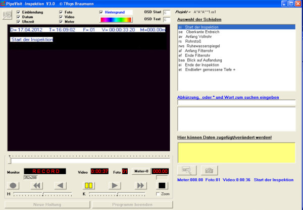 Professional and easy-to-use softwarePipeVisit Inspection•Monitor for video inspection (also full screen)•Data overlay (date, time, photo number, depth)•Display of the camera depth in the well (resolution in 1 cm),•Font color for data display and background freely selectable•Entering abbreviations for damage texts•Save damage images in JPEG format•Digital MPEG-4 video recorderPipeVisit Office•Complete documentation and archiving•Control and post-processing of inspection data•Play the inspection video•Checking the damage patterns•Setup for editing damage texts and selection specifications•Printout of an inspection report with well graphics and inspection data•Printing out photo pages with images and damage textDownload:PDF PipeVisit Investigation report